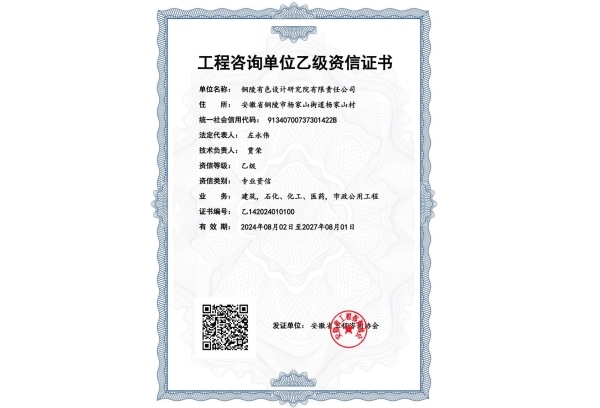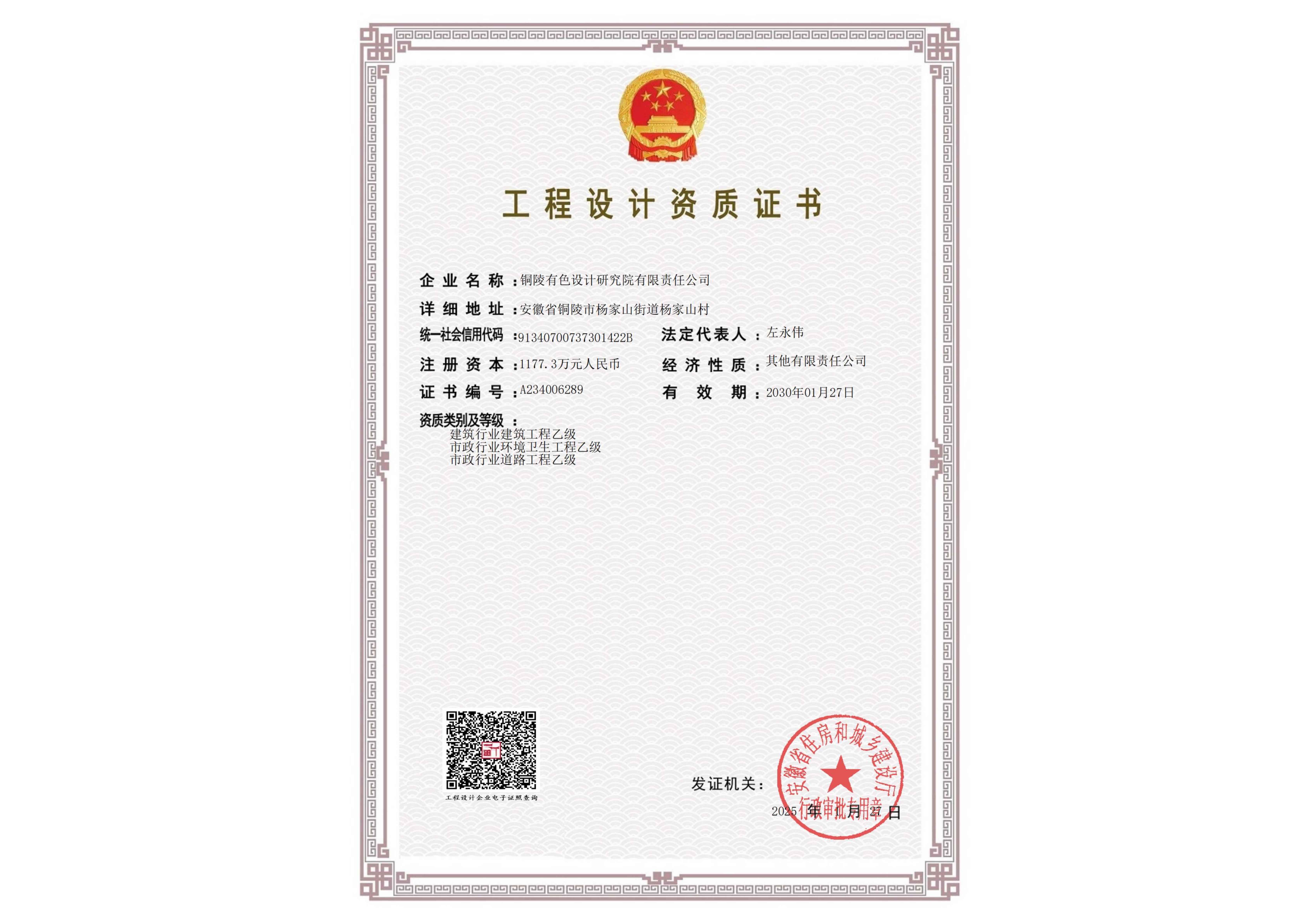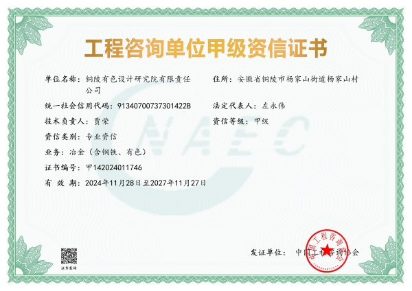 工程設計(冶金行業(yè)甲級)資質(zhì)證書